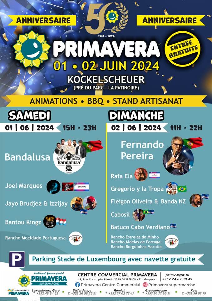 O AESA foi convidado pelos Supermercados Primavera a participar na sua festa dos 50 years, que irá decorrer nos dias 1 and 2 de Junho em Kockelscheuer. O AESA vai ter uma tenda onde iremos mostrar o nosso Escutismo através de atividades/jogos e também realizar uma angariação de fundos com venda de lembranças e confecção de crepes/gauffres, com ajuda dos nossos Pioneiros, Comissão de pais e Chefia.